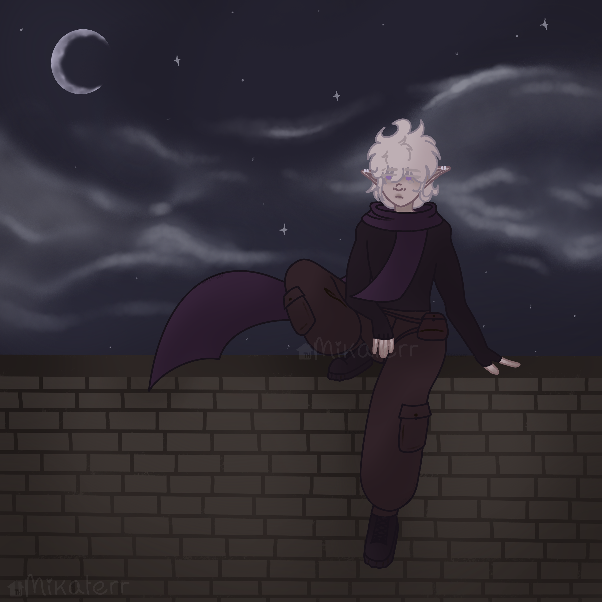 I tried out a few piercings, and then finally made a full drawing of him with background. Very recently I revisited his design after not messing with it for over a year, and changed him to look more like how I’d imagined him in my head. I sketched out some ideas for the hair, adding braids and spikey back hair pieces as the base. I’m still not happy with the result but I do like the braids. I gave his eyes more of a pinkish-purple hue instead of blue-purple, and lightened his hair and skin back to the first draft color. I changed his nose to look more downturned and soft, which went so much easier than the first draft since I studied faces more in the last year.