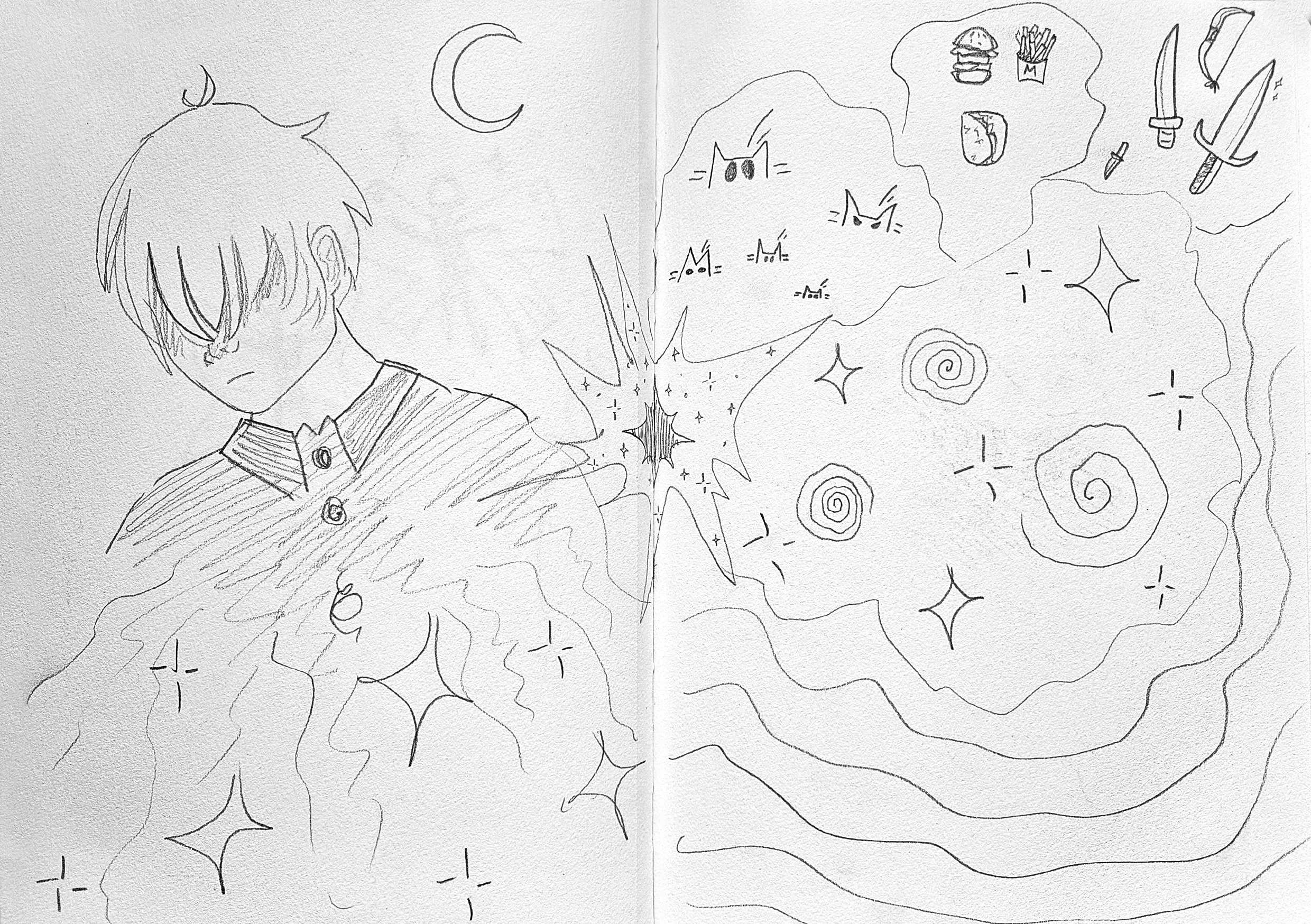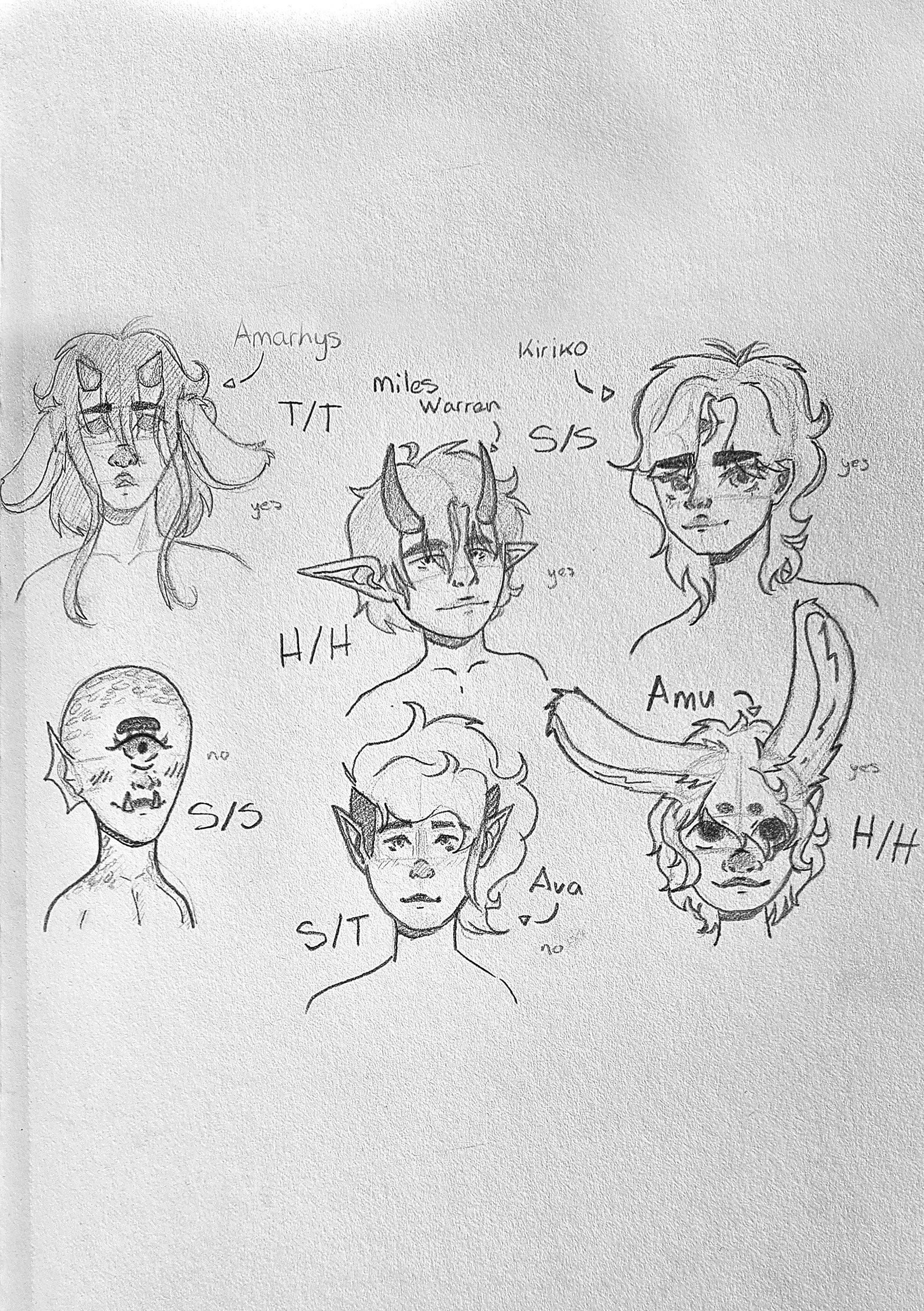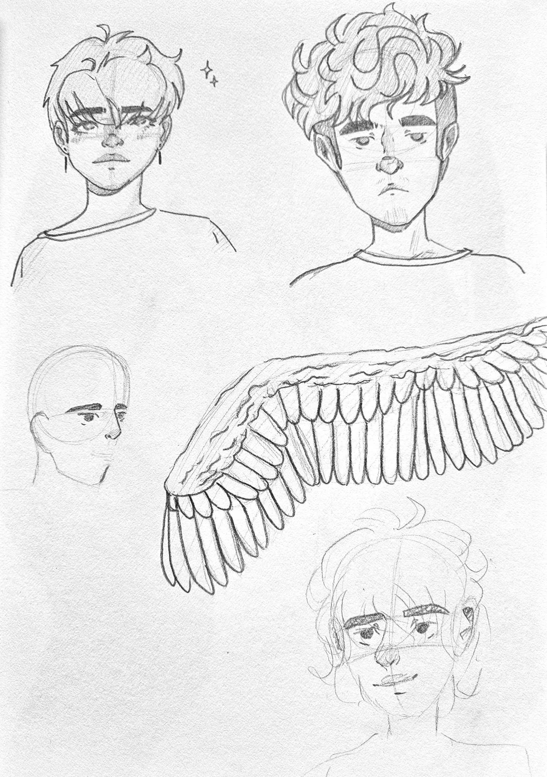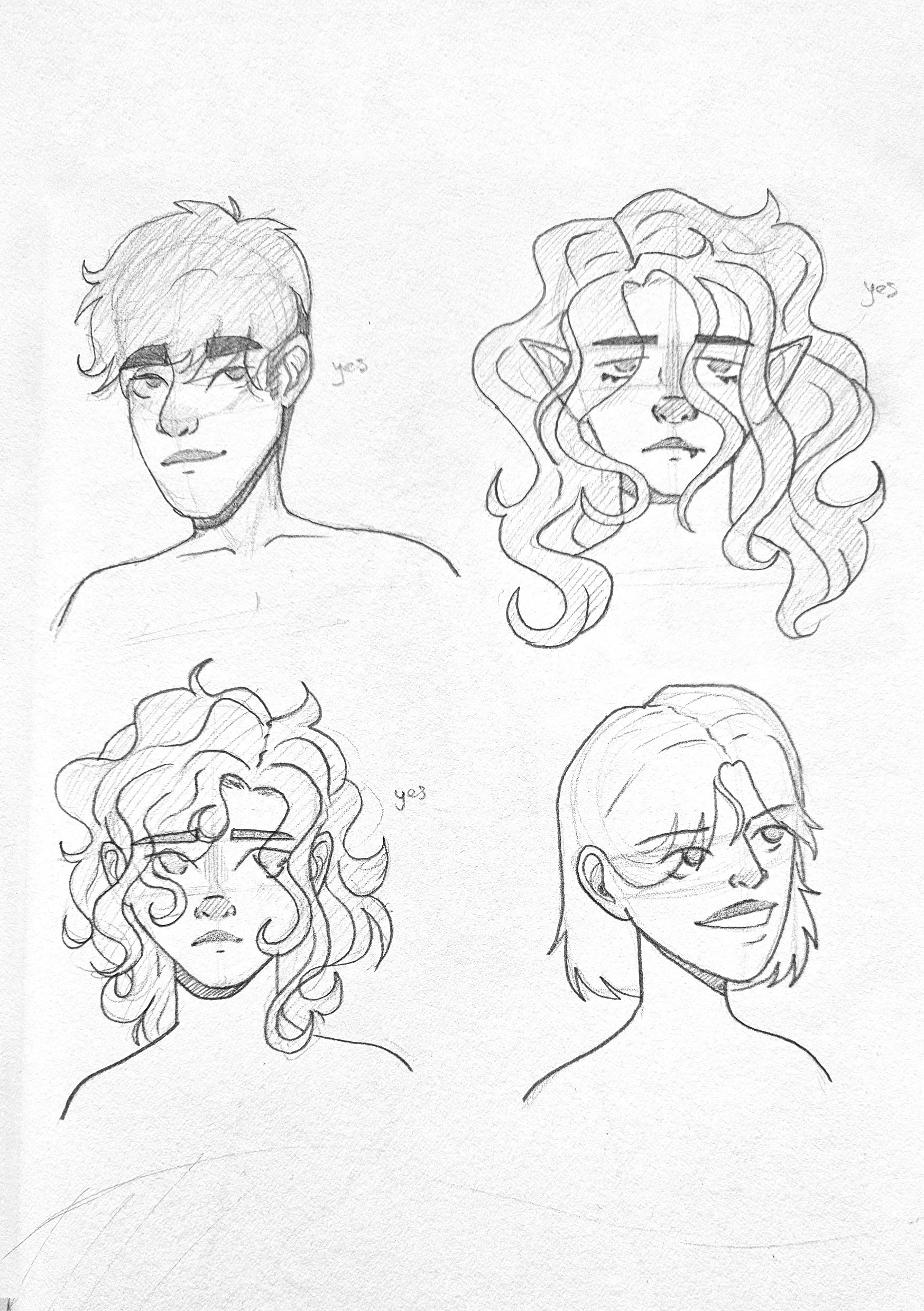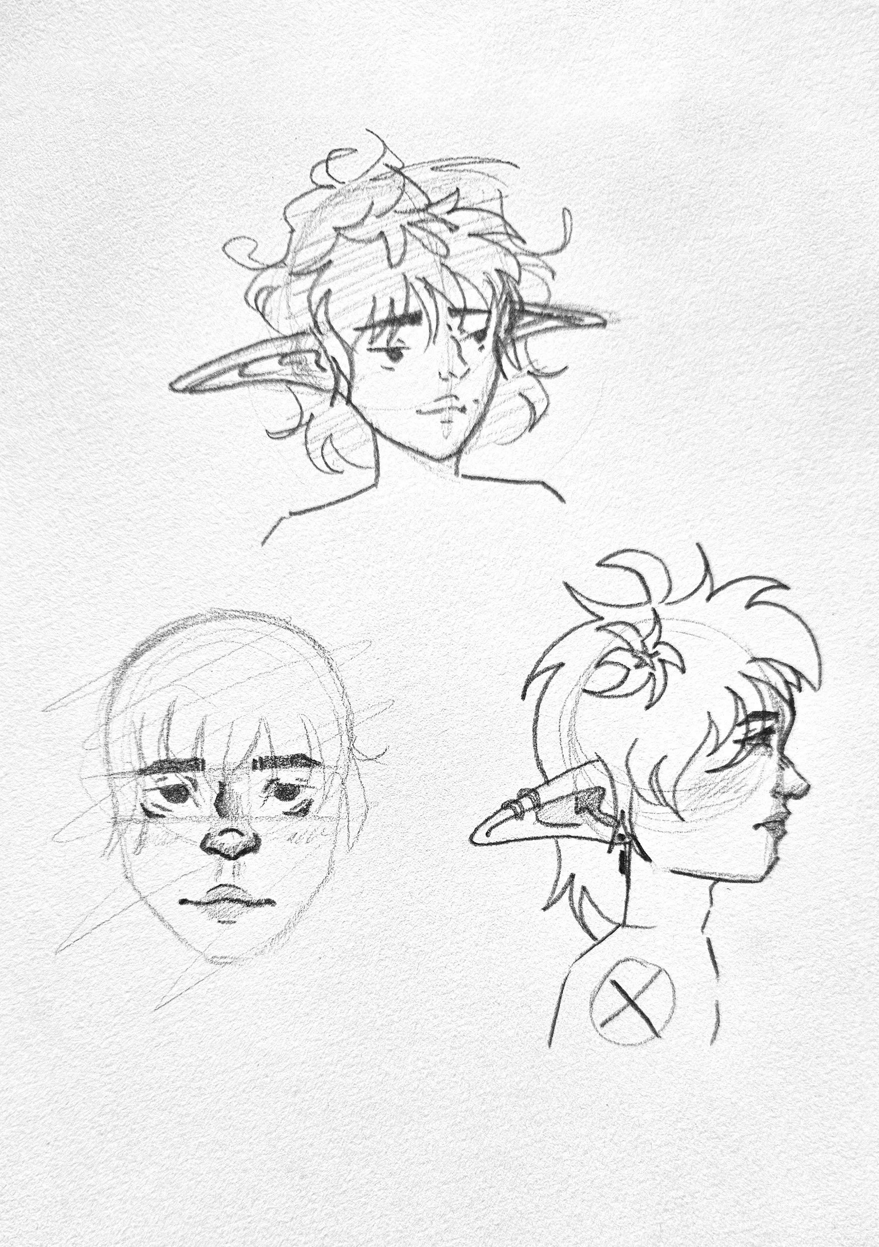 This is the main character for my comic, Ezra. These are all of the designs/design ideas I’ve made of him. He started as a girl with short hair, and as a human. I didn’t really like this design, so I sketched out an idea for a different hairstyle, this is also where I decided to make him a boy. I played around with the hairstyle a bit more, and decided to make him an elf. I put a sort of moon crescent shape in his hair, since I wanted his design to be moon-based.