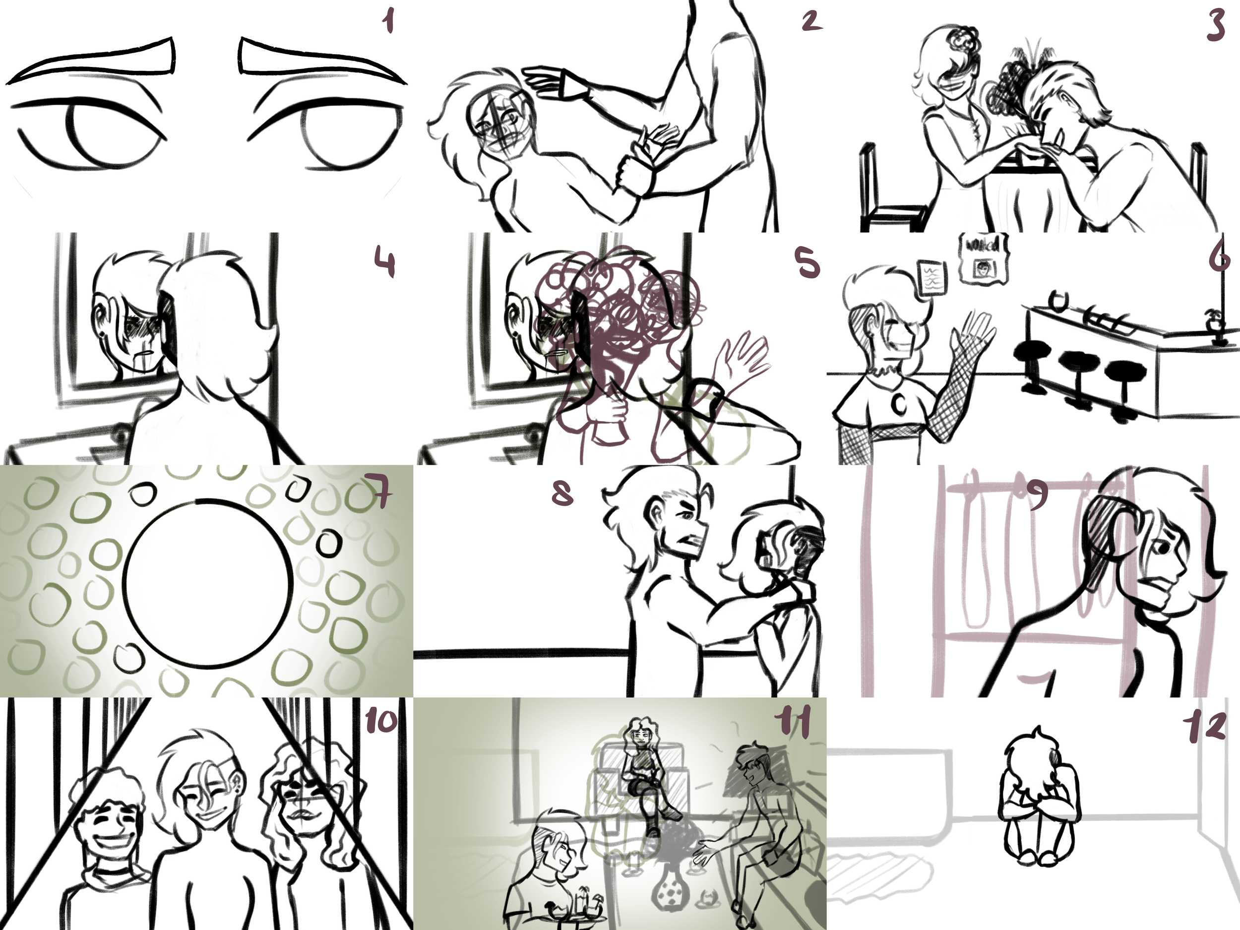 Now that that’s out of the way, the first one is a storyboard showing the backstory of Thena, a character of mine. The background music was gonna be Ghost - Confetti. I made the storyboard to show her toxic relationship with her ex, and how she got into the main friend group she’s in now. I really loved laying everything out to lyrics and imagining the product that would come out of it, and I’d still love to re-make it one day with the updated designs and story.